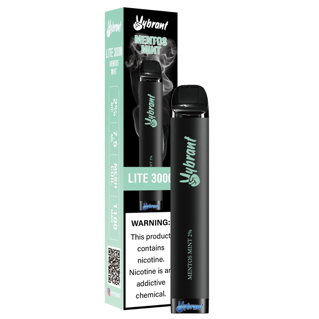 Introducing the Vybrant Mentos Mint Lite 3000, a compact disposable vape featuring crisp, sweet mint flavor and a slim, lightweight design that makes it perfect for everyday use.